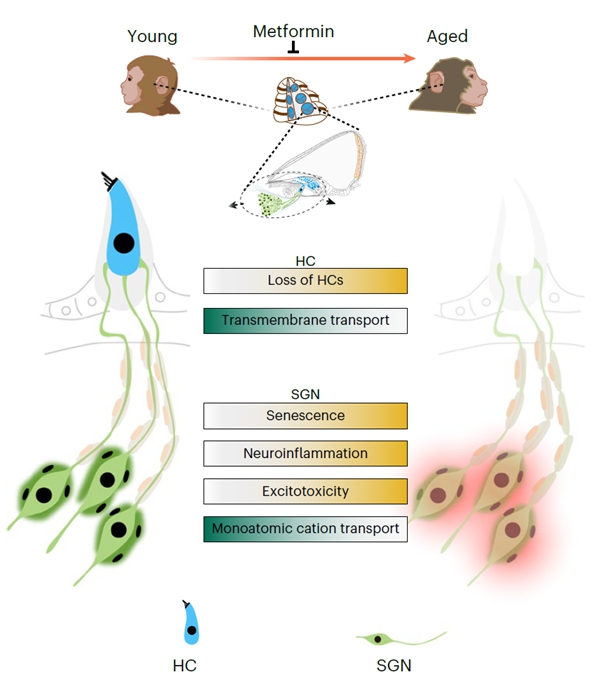 该项研究首次系统性地解析了灵长类耳蜗衰老的细胞轨迹与分子特征,揭示了关键易感细胞类型及其特异性衰老驱动力(如SLC35F1),并证实了二甲双胍在灵长类模型中延缓耳蜗衰老的显著效果,为老年性耳聋的干预提供了双重路径。该成果不仅显著深化了对灵长类听觉退行性病变的理解,为老年性耳聋的早期预警提供了关键生物标志物,更在机制解析与药物干预层面为开发创新性靶向治疗策略奠定了坚实的理论基础与实验依据,有望为老年性耳聋的防治开辟潜在的临床干预路径。