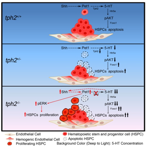 The Hematopoiesis and Cardiovascular Development Group led by Prof. Feng Liu identifies 5-hydroxytryptamine (5-HT, also called serotonin) as a novel endogenous regulator of HSPC development. 5-HT can enhance the colony formation ability of HSPCs in vitro. A decrease of 5-HT synthesized in the aorta-gonad-mesonephros (AGM) of tph2+/- and pet1-cre;tph2+/fl embryos leads to the impairment of HSPCs development and reconstitution ability in the recipients. Further analysis in vec-cre;tph2+/fl embryos shows 5-HT synthesized in the endothelial cells is also important for HSPCs development. Mechanistically, we found that 5-HT inhibits the AKT-Foxo1 signaling cascade to protect the earliest HSPCs in intra-aortic hematopoietic cluster (IAHC) from excessive apoptosis. This process is mediated by Htr5a, a 5-HT receptor. Finally and unexpectedly, we noticed that HSPC development is relatively normal in tph2-/- and pet1-cre;tph2fl/fl embryos, although the excessive apoptosis of HSPCs remains. We further showed that the Nkx2.2-Lmx1b-Pet1 cascade and the upstream Shh signaling are up-regulated in tph2-/- embryos, which in turn re-activates Pet1-ERK signaling. This activated ERK signaling in tph2-/- embryos promotes the proliferation of hematopoietic clusters, and therefore partially restores the defective HSPC development observed in tph2+/- embryos.