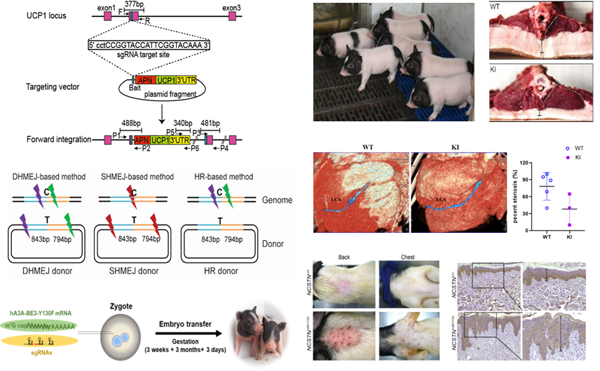 建立了猪基因组高效的基因编辑体系,实现了大片段定点插入、敲除、点突变以及多基因同时编辑。通过基因编辑方法进行猪的基因组遗传修饰,为培育猪新品种提供了育种材料和分子标记,为构建生物医学研究的大动物模型的应用奠定了基础。