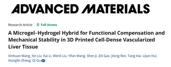 中国科学院动物研究所/北京干细胞与再生医学研究院顾奇团队,研发一种基于微凝胶-水凝胶复合的新材料,利用化学交联和物理缠结形成具有异质性的网络结构,能够装载高细胞密度的肝细胞;通过嵌入式生物打印技术实现多尺度管网构建,具有机械完整性和直接血管吻合能力。体外和体内实验证明了该材料的机械性能、生物相容性、促血管生成能力以及对肝细胞功能的支持能力,最终在大鼠急性肝损伤模型中实现了快速的功能补偿。该成果以A Microgel–Hydrogel Hybrid for Functional Compensation and Mechanical Stability in 3D Printed Cell-Dense Vascularized Liver Tissue为题,2025年4月13日发表在Advanced Materials期刊上。