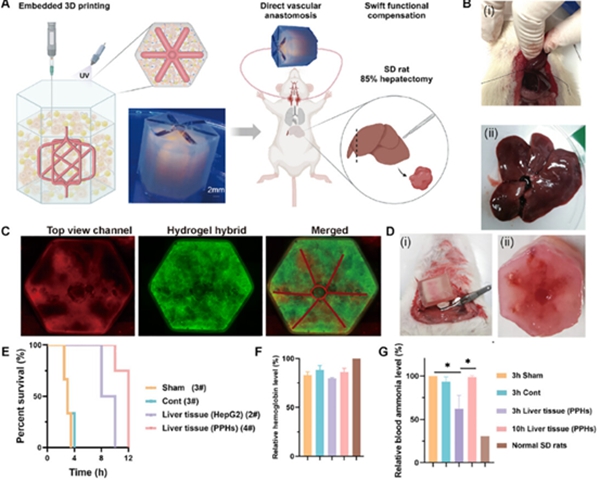 通过优化GMM与HA-MA的比例,调整交联组分空间占比和交联密度来最小化生物材料的使用,实现了具有高机械性能的封装高密度肝细胞的肝组织构建。最后,通过嵌入式生物打印创建多尺度血管网络,直接整合到宿主循环系统中,支撑高密度血管化肝组织存活,为85%肝切大鼠急性肝损伤模型提供快速的功能补偿,延长生存时间。