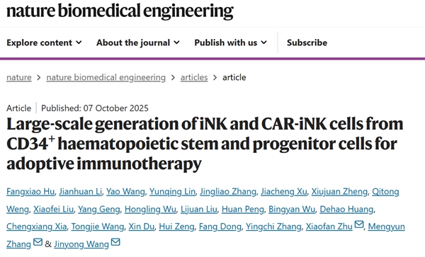 2025年10月7日,Nature Biomedical Engineering杂志在线发表了由中国科学院动物研究所、北京干细胞与再生医学研究院王金勇研究组题为Large-scale generation of iNK and CAR-iNK cells from CD34+ hematopoietic stem and progenitor cells for adoptive immunotherapy的研究论文(图1)。在该研究中,科研人员整合了CD34造血干祖细胞 CAR工程化、干细胞扩增和NK谱系定向诱导技术,成功建立了高效诱导脐带血造血干祖细胞(CD34+ HSPCs)体外产生iNK(induced NK)细胞及CD19 CAR-iNK细胞的工艺制备体系。经过42天的诱导,实现了将单个CD34+ HSPCs诱导输出107级别的iNK细胞或106级别的CD19 CAR-iNK细胞。